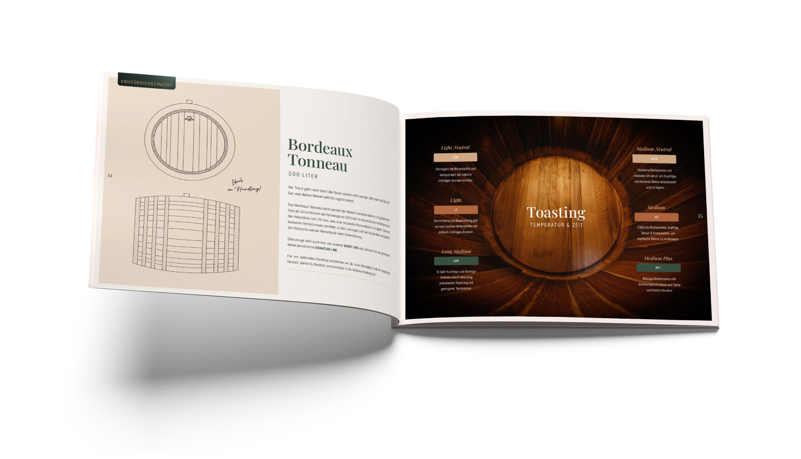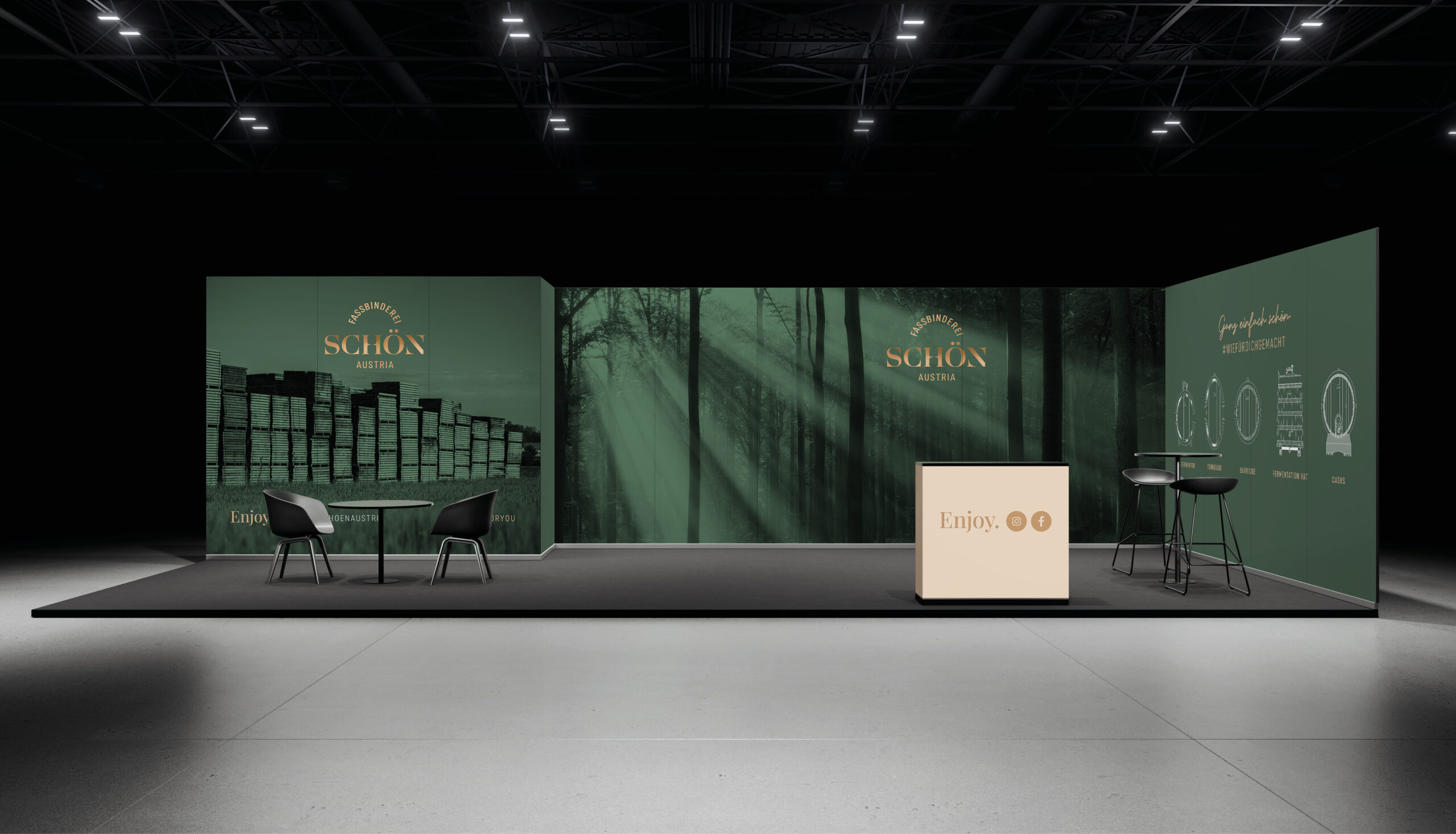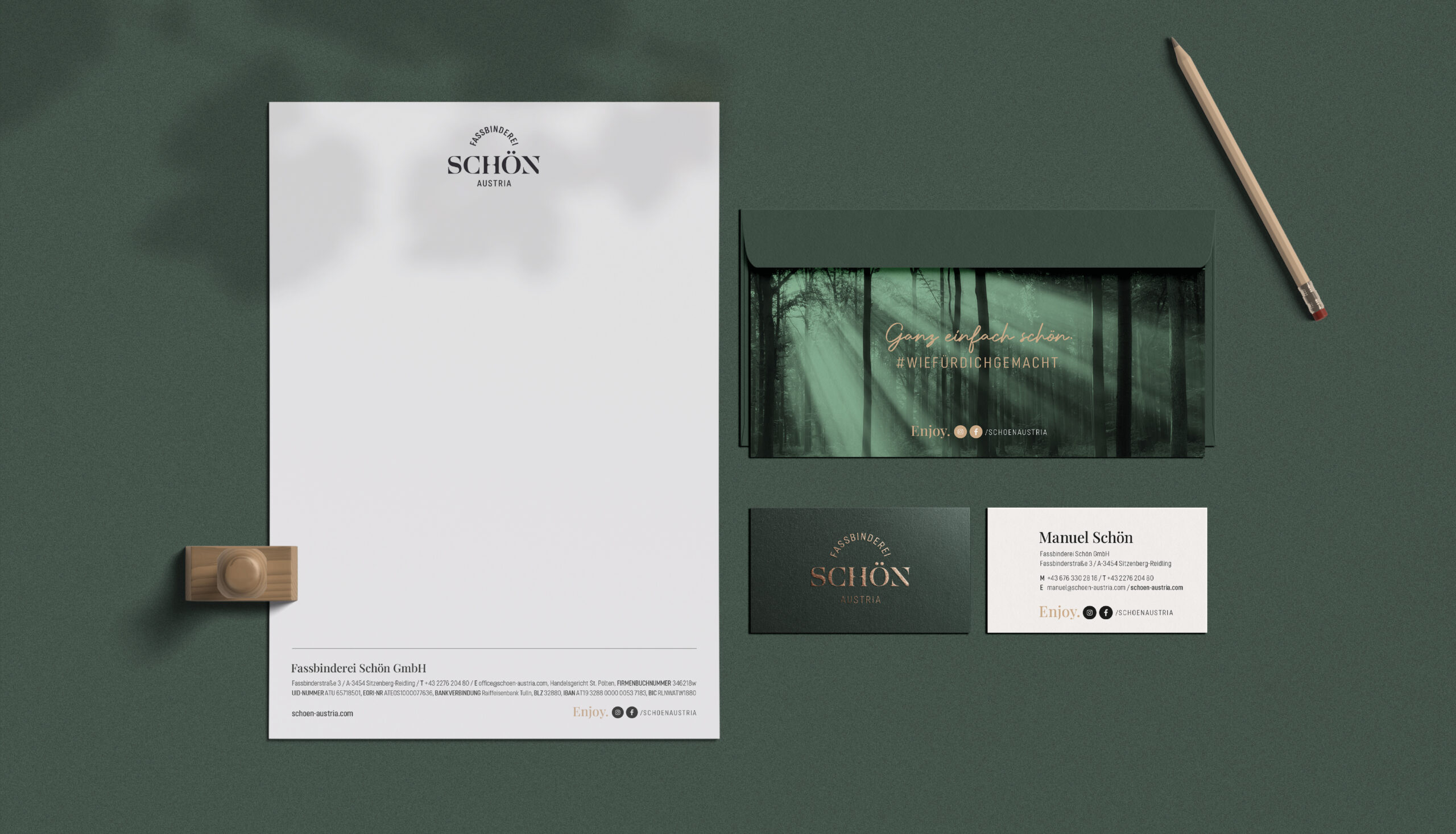 Seit 2022 begleite ich die Fassbinderei Schön in Markenaufbau, Wording und visueller Gestaltung. Vom ersten Konzept bis zum finalen Auftritt entstand eine Marke, die Handwerk, Haltung und Ästhetik miteinander verbindet. All das spiegelt sich außerdem in der Materialwahl wider: kupfergoldene Heißfolienprägung trifft auf tiefes Grün, edles Gmund-Papier auf feine Nuancen verschiedener Holztöne. Ein Branding, das sich konsequent durch alle Berührungspunkte zieht – von Produktlinien über Verkaufs- und Imageunterlagen bishin zum Messestand. Eben wie für die Fassbinderei gemacht. Die Imagebroschüre wurde außerdem 2024 beim NÖ Werbepreis mit Gold ausgezeichnet.